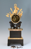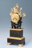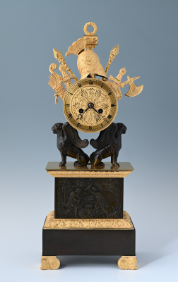 Two sphinxes supporting the clock face, crowned by a helmet, sword, quiver, halberd and spear.
