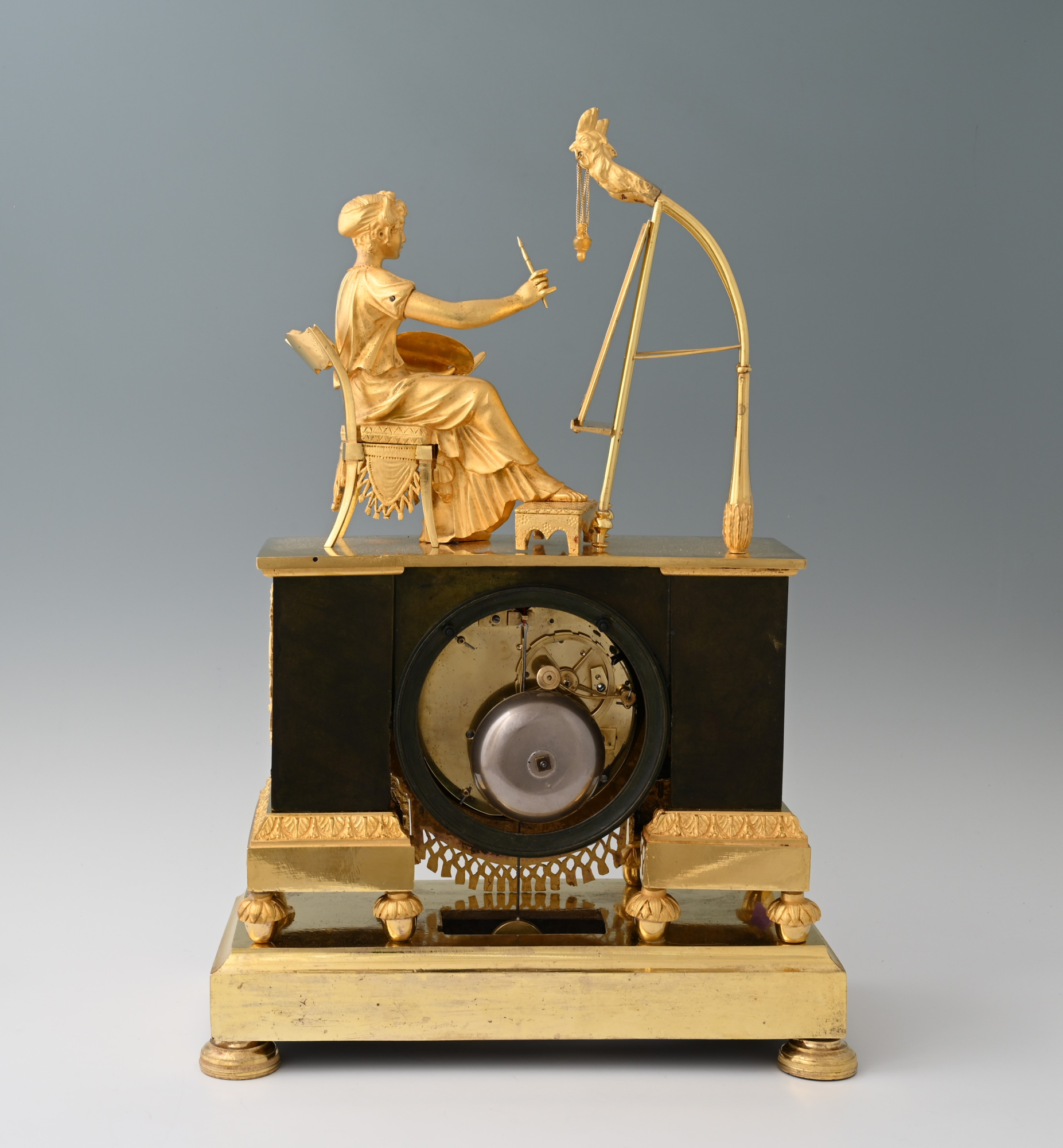 The footstool and chair with sabre legs and a seat back decorated with fringes - an ornament that also recurs under the dial - are very representative of the taste of the time.