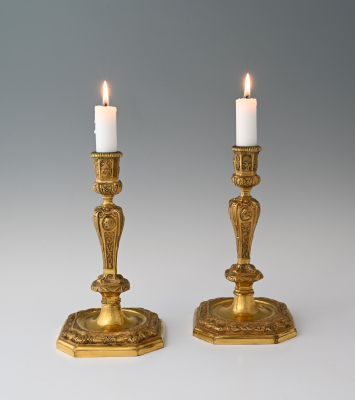 The candlesticks are richly decorated with garlands, acanthus leaves, medallions and draperies in the style of the “Grande Siècle”.