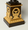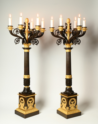 A fine and large pair of French Empire column-form candelabra with patinated and gilt bronze decoration to the column and square plinth base.