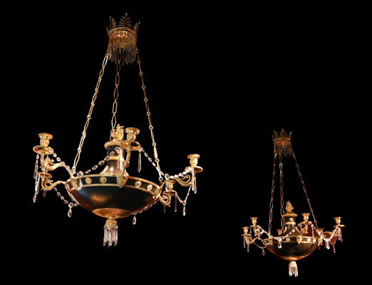 A rare near pair of Russian Empire discus chandeliers