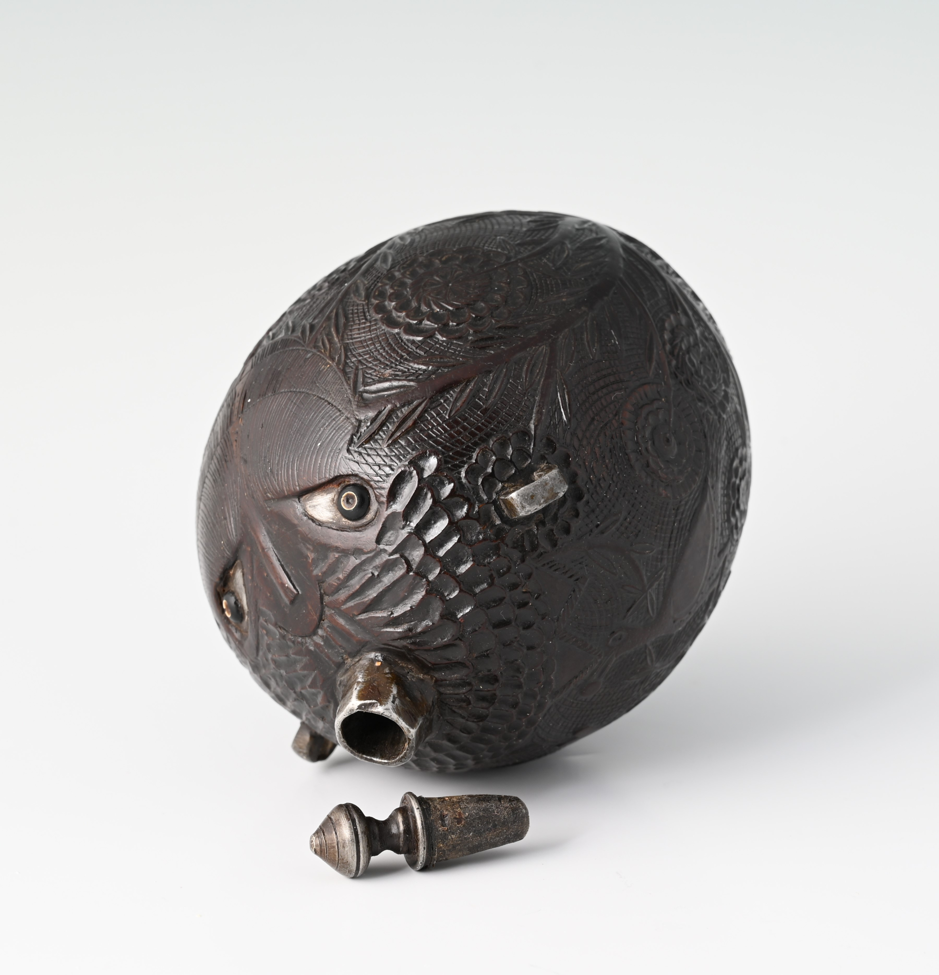 'Bugbear’ coconut flasks were carved by sailors or soldiers on long sea voyages who visited the East or West Indies in the late 18th/early 19th centuries.