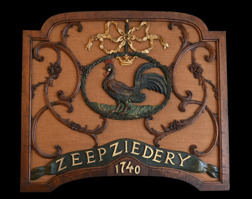 Een gebeeldhouwd houten bovenlicht, oorspronkelijk gemaakt voor de zeepfabriek ‘De Gekroonde Haan’, die gevestigd was in Leiden.